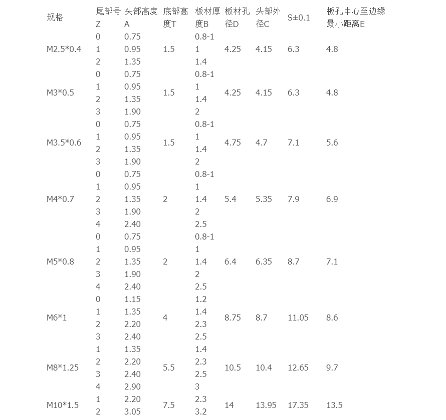 3.適用于各種厚度的板材,Zui小厚度0.8mm,使用時(shí)必須根據(jù)板材厚度和螺母規(guī)格,才能確定A尺寸對(duì)應(yīng)的尾部號(hào)Z,用戶根據(jù)板材厚度依據(jù)表中尾部號(hào)選樣訂貨;
